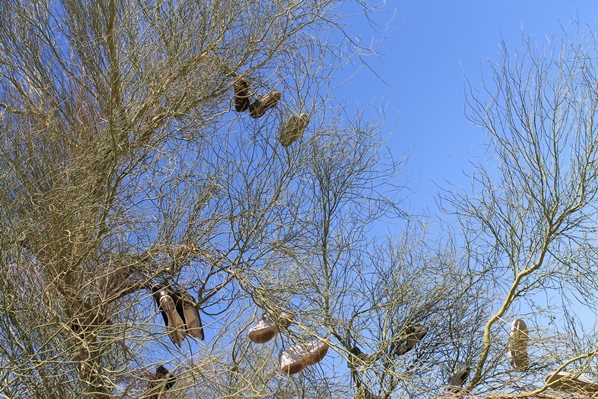 Az út ezen szakaszán több cipőfát is jelöl a térképünk, kettőt sikerült megtalálnunk. A cipőfák eredete, hogy amikor valaki megtette az utat, akkor a cipőjét feldobta egy fára, így ezek a cipőfák mindig azokon a helyeken vannak, ahol valamikor az út véget ért. Gondolom errefelé még lesz néhány.