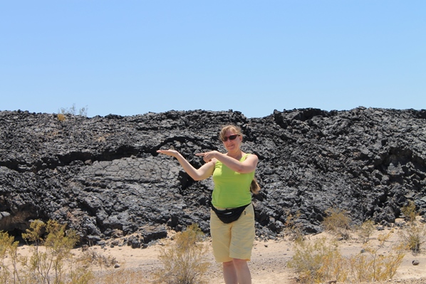 Kalifornia ide vagy oda, még mindig sivatag mindenhol. Kősivatag, és földsivatag. Csak a lakott (öntözött?) részeknél vannak pálmafák, egyébként még fűcsomók se nagyon. Elhaladtunk néhány rég kihűlt vulkán mellett, érdekes volt a környezetében a megkövesedett fekete láva. Szerettem volna felvenni egy lávakövet, ezért megálltunk, és akkor vettem észre hogy -bár úgy néz ki mintha csak oda lennének szórva a fekete kövek-, nem lehet őket felemelni, mert oda vannak olvadva, valahogy az egész egyben van, mint egy groteszk aszfaltburkolat a hegyen. Sokat kellett keresgélni egy pici darabért.