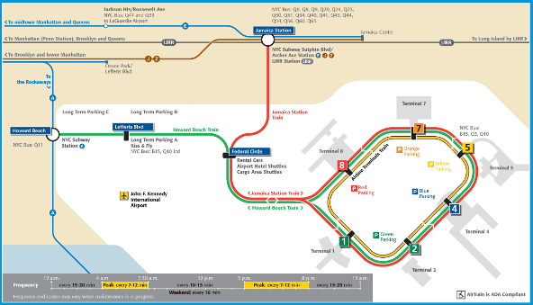 A JFK szerkezetileg egy óriási álomcsapdára hasonlít, aminek a csúcsai a terminálok Aki látott már ilyet az el tudja képzelni, aki nem, annak: egy kör, aminek van 8 állomása, és mindegyikből kis járatok indulnak. A 8 csúcs össze van kötve egy magasvasúttal. Ez a magasvasút körbe jár 1-től 8-ig, azzal a kis bonyolítással, hogy 8 után elkanyarodik Queens felé, és elhagyja a repteret (zöld). Van egy másik sínpár, ami visszafelé megy, és az nem hagyja el a repteret, csak körbe-körbe jár (sárga). A piros a zöldhöz hasonló csak másfelé megy ki a városba.