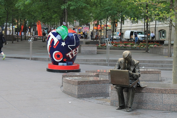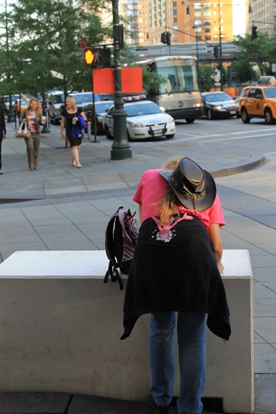 A hotdog ugyanolyan volt mint itthon (jéééé), de a feeling az igazi newyorkos volt, mert leültünk egy parkban valami kőpárkányra megenni. Ahogy ettünk, szépen lassan elkezdett telni a park, és öltönyös-nyakkendős emberek simán letelepedtek hasonló kőpárkányokra enni. Ennek az életformának még szobra is van, íme: