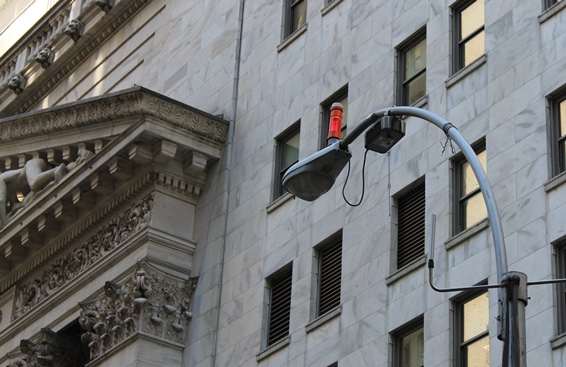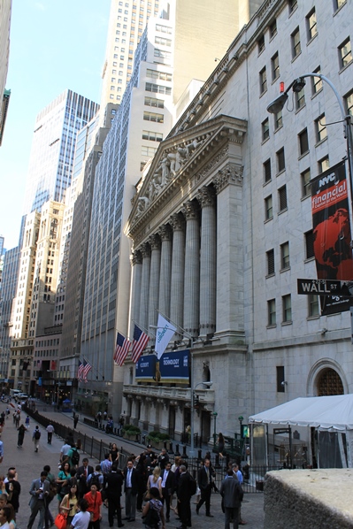 Semmi dobpergés, egyszercsak ott álltunk a tőzsde előtt, ugyanolyan newyorki járókelőkkel körülvéve mint addig. Talán kicsit kevesebb volt a vietnami gumipapucs és több az öltöny, de nem sokkal. Az utca nyüzsgő, emberekkel teli, már-már ugyanolyan lenne mint a többi, ha nem lenne az a rendőrkordon meg elkerítés a bejáratok körül. Oda bizony még a járdára is csak akkor mehet valaki ha ott dolga van, és az ellenőrzésen átesett.
